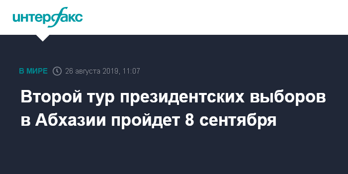 Москва. 26 августа. INTERFAX.RU - Второй тур выборов президента Абхазии, в соответствии с избирательным законодательством республики, пройдет 8 сентября, сообщил в понедельник "Интерфаксу" глава Центральной избирательной комиссии (ЦИК) страны Тамаз Гогия.