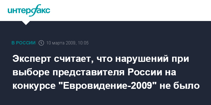 Москва. 10 марта. INTERFAX.RU - Западный эксперт по конкурсу "Евровидение" считает, что при организации конкурса по отбору российского представителя на "Евровидение-2009" нарушений допущено не было.