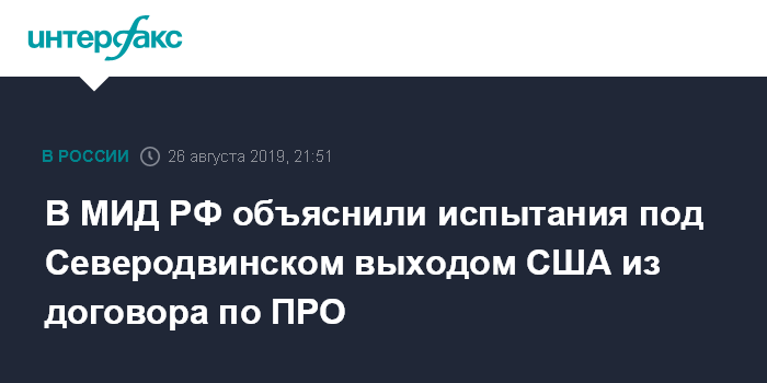 Москва. 26 августа. INTERFAX.RU - Постпред РФ при международных организациях в Вене Алексей Карпов сообщил, что испытания на военном полигоне под Северодвинском были связаны с разработкой оружия, которое РФ начала создавать из-за выхода США из договора по ПРО.