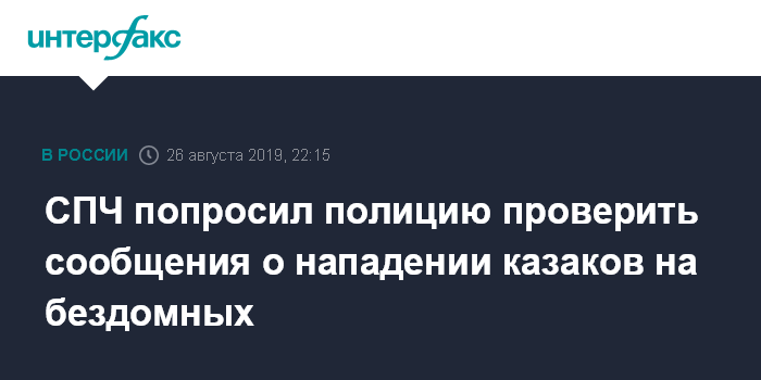 Москва. 26 августа. INTERFAX.RU - Совет по правам человека при президенте РФ (СПЧ) обратился к главе столичной полиции в связи с нападением неизвестных в казачьей форме на бездомных у офиса фонда "Справедливая помощь Доктора Лизы".