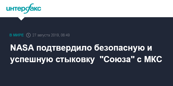 Москва. 27 августа. INTERFAX.RU - Повторная попытка стыковки транспортного пилотируемого корабля "Союз МС-14" с Международной космической станцией во вторник была проведена "безопасно и успешно", сообщило Национальное управление по аэронавтике и исследованию космического пространства США (NASA).