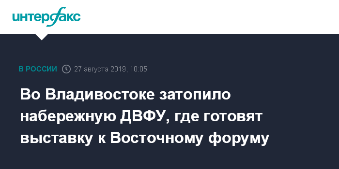 Москва. 27 августа. INTERFAX.RU - На острове Русский во Владивостоке подтопило Университетскую набережную, где строят павильоны выставки "Улицы Дальнего Востока" к Восточному экономическому форуму, сообщила пресс-служба мэрии города.