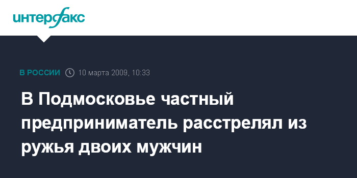 Москва. 10 марта. INTERFAX.RU - В Чеховском районе Подмосковья частный предприниматель из Москвы расстрелял двоих жителей Люберецкого района, один из пострадавших скончался на месте, сообщил "Интерфаксу" во вторник источник в правоохранительных органах региона.