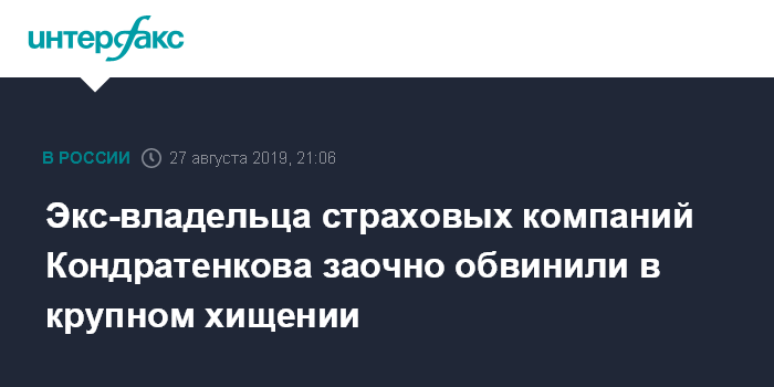 Москва. 27 августа. INTERFAX.RU - Бывшему владельцу нескольких страховых компаний Александру Кондратенкову заочно предъявлено обвинение по делу о хищении более 67 млн рублей по фиктивным документам.