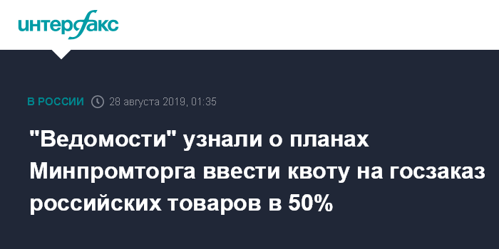"Ведомости" узнали о планах Минпромторга ввести квоту на госзаказ российских товаров в 50%
