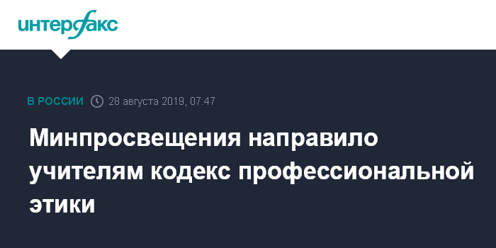 Москва. 28 августа. INTERFAX.RU - Министерство просвещения РФ направило в российские субъекты примерное положение о нормах профессиональной этики для педагогических работников, разработанное совместно с Общероссийским профсоюзом образования.