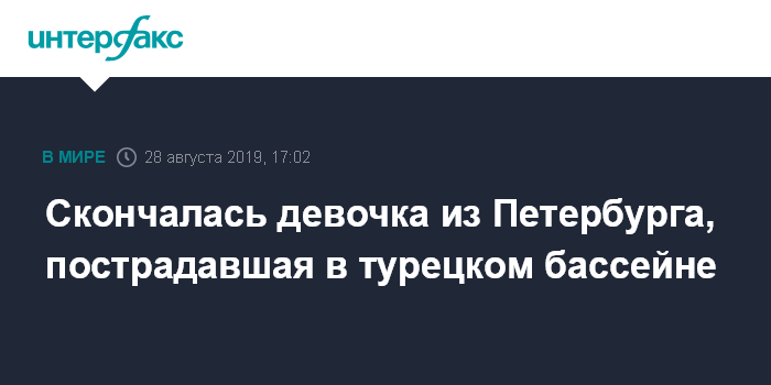 Москва. 28 августа. INTERFAX.RU - 12-летняя петербурженка, которая серьезно пострадала, купаясь в бассейне на турецком курорте, скончалась. Об этом сообщил "Интерфаксу" информированный источник, не уточнив, когда это произошло.