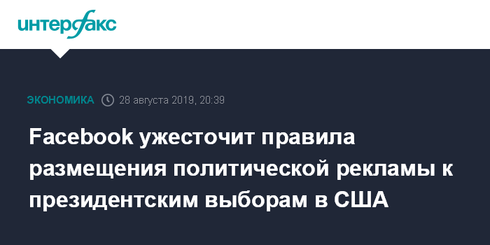 Москва. 28 августа. INTERFAX.RU - К президентским выборам 2020 года в США Facebook с середины сентября ужесточит авторизацию американских заказчиков, которые хотят разместить в соцсети политическую рекламу, будет показывать пользователям больше информации о каждом рекламодателей и начнет вести список социальных проблем в США. Об очередных мерах по защите выборов в США компания сообщила 28 августа.