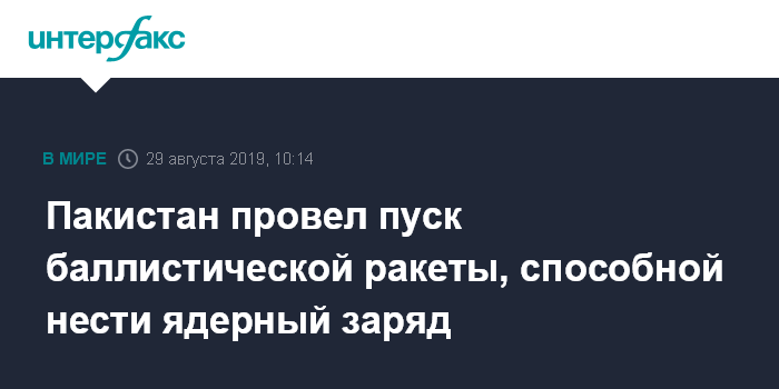 Москва. 29 августа. INTERFAX.RU - В Пакистане военные объявили об успешных испытаниях баллистической ракеты "Газнави" класса земля-земля, способной нести ядерную боеголовку. Об этом сообщил пресс-секретарь вооруженных сил страны Асиф Гафур и выложил видеозапись пуска в твиттере.