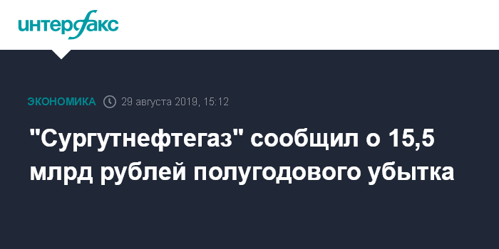 Москва. 29 августа. INTERFAX.RU - В I полугодии 2019 года "Сургутнефтегаз" получил 15,5 млрд рублей убытка по МСФО против 390 млрд рублей прибыли годом ранее. Об этом говорится в отчете компании.