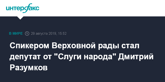 Москва. 29 августа. INTERFAX.RU - Председателем Верховной рады Украины избран председатель президентской партии "Слуга народа" Дмитрий Разумков. За него на первом пленарном заседании нового созыва проголосовали 382 народных депутата.