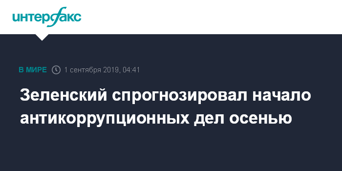 Москва. 1 сентября. INTERFAX.RU - Президент Украины Владимир Зеленский ожидает антикоррупционных процессов осенью, с началом работы Высшего антикоррупционного суда Украины и нового генерального прокурора, и допускает "аукцион уголовных дел".