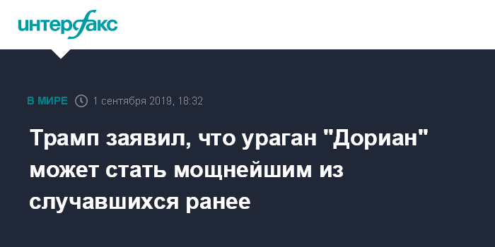 Трамп заявил, что ураган "Дориан" может стать мощнейшим из случавшихся ранее
