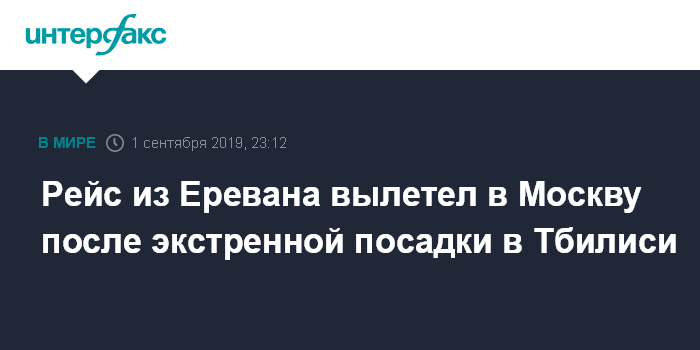 Москва. 1 сентября. INTERFAX.RU - Самолет авиакомпании "Армения" Боинг-737, совершавший рейс Ереван-Москва, который вечером в воскресенье сделал экстренную посадку в аэропорту Тбилиси, уже вылетел в Москву, сообщили "Интерфаксу" в международном аэропорту грузинской столицы.