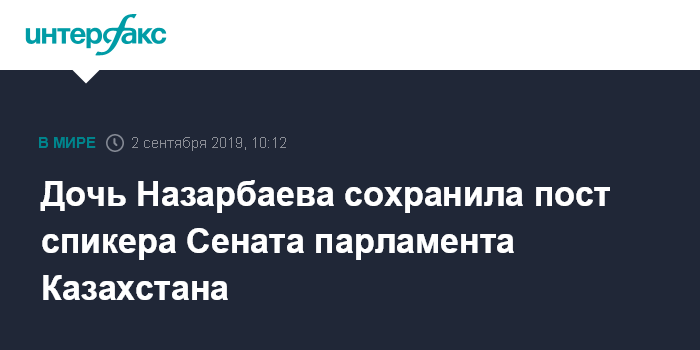 Москва. 2 сентября. INTERFAX.RU - Дочь первого президента Казахстана Дарига Назарбаева переизбрана спикером Сената парламента страны. Ее выдвинул на эту должность президент Касым-Жомарт Токаев, на заседании ее кандидатуру представил глава администрации президента Крымбек Кушербаев.