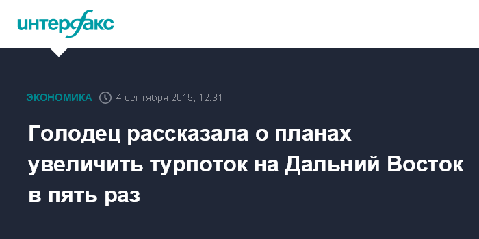 Москва. 4 сентября. INTERFAX.RU - Правительство России планирует увеличить турпоток на Дальний Восток в ближайшие годы в несколько раз, с этой целью введены электронные визы, выделяются средства из бюджета на программы развития туризма, сообщила вице-премьер Ольга Голодец на ВЭФ-2019.