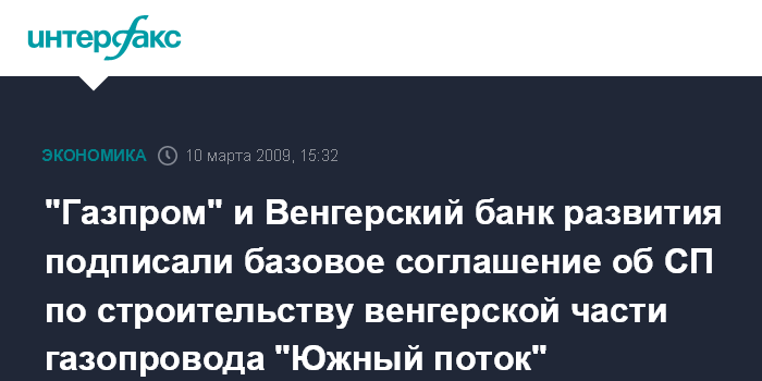 Москва. 10 марта. INTERFAX.RU - Председатель правления ОАО "Газпром" Алексей Миллер и президент Венгерского банка развития Янош Ерош подписали Базовое соглашение о сотрудничестве по строительству газопровода и транзиту природного газа через территорию Венгерской республики в рамках проекта "Южный поток".