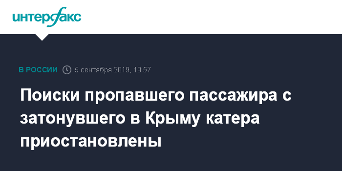 Москва. 5 сентября. INTERFAX.RU - Поиски одного пассажира прогулочного катера, который в четверг, 5 сентября, затонул в районе Судака на юге Крыма, продолжатся в пятницу. Об этом сообщили "Интерфаксу" в пресс-службе МЧС республики.