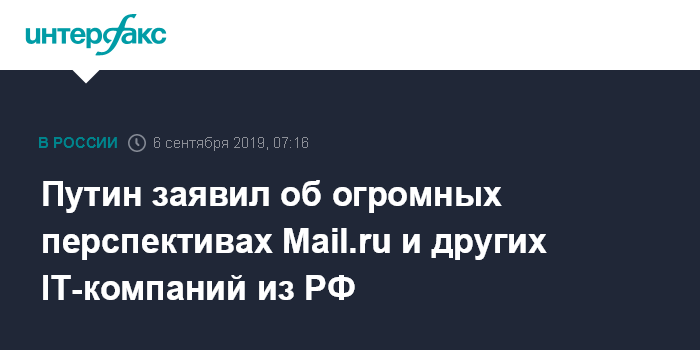 Москва. 6 сентября. INTERFAX.RU - Технологическая компания Mail.ru Group и другие лидеры российской IT-отрасли имеют большие перспективы, но их развитие проходит в условиях жесткой международной конкуренции, заявил президент Россиии Владимир Путин на полях ВЭФ-2019 в ходе встречи с представителями дальневосточной общественности.