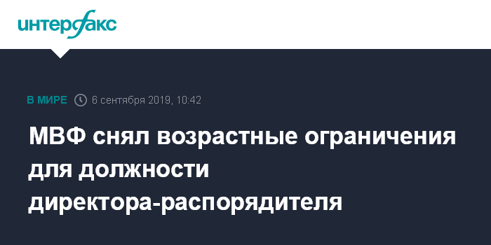 Москва. 6 сентября. INTERFAX.RU - Совет управляющих Международного валютного фонда (МВФ) простым большинством голосов принял решение снять любые возрастные ограничения для должности директора-распорядителя, говорится в пресс-релизе фонда.