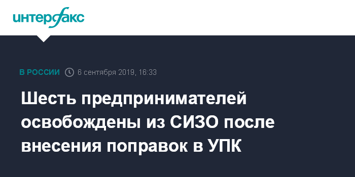 Москва. 6 сентября. INTERFAX.RU - Шесть предпринимателей переведены из СИЗО под домашний арест по итогам первого месяца действия поправок, введенных в Уголовно-процессуальный кодекс РФ, отметили в пресс-службе уполномоченного по защите прав предпринимателей Бориса Титова.