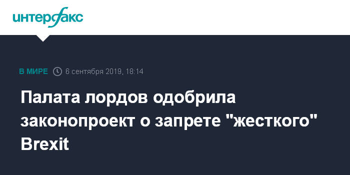 Москва. 6 сентября. INTERFAX.RU - Палата лордов - верхняя палата британского парламента - в пятницу поддержала законопроект, запрещающий так называемый "жесткий" вариант Brexit, то есть препятствующий выходу Великобритании из Евросоюза без соглашения с ЕС, сообщает телеканал Sky News.