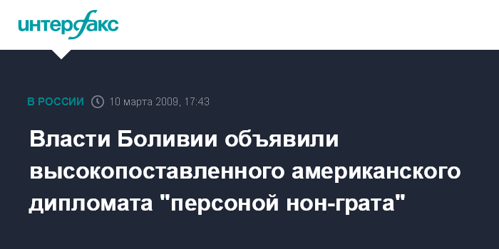Москва. 10 марта. INTERFAX.RU - Президент Боливии Эво Моралес объявил во вторник "персона нон-грата" второго секретаря посольства США в Боливии Франсиско Мартинеса. Теперь американский дипломат должен покинуть страну в течение 72 часов.