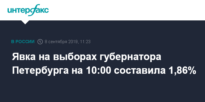 Москва. 8 сентября. INTERFAX.RU - Явка на выборах губернатора Санкт-Петербурга по состоянию на 10:00 составила 1,86%, сообщил член городской избирательной комиссии Юрий Кузьмин журналистам в воскресенье.