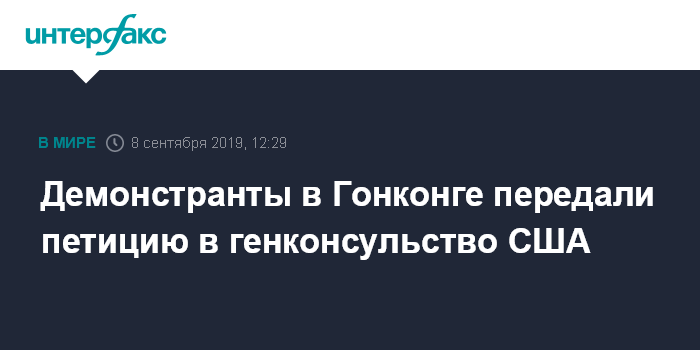 Москва. 8 сентября. INTERFAX.RU - Участники протестов в Гонконге в воскресенье с пением гимна США и плакатами, призывающими Штаты оказать помощь в "освобождении" города от контроля со стороны Пекина, прошли к зданию американского генерального консульства и передали дипломатам петицию.