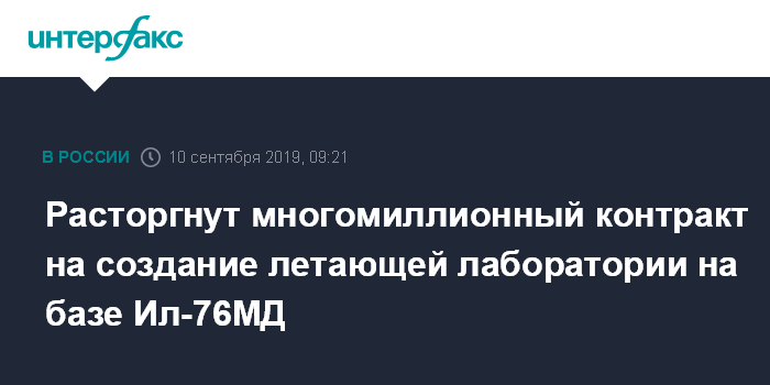 Москва. 10 сентября. INTERFAX.RU - Расторгнут контракт на переоборудование транспортника Ил-76МД в самолет-носитель гиперзвуковой летающей лаборатории, следует из информации "СПАРК-Интерфакс".