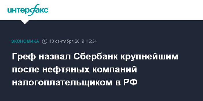 Москва. 10 сентября. INTERFAX.RU - Сбербанк России стал крупнейшим после нефтяных компаний налогоплательщиком в России, сообщил глава Сбербанка Герман Греф на встрече с президентом РФ Владимиром Путиным.