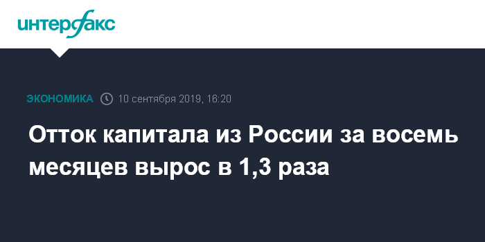 Москва. 10 сентября. INTERFAX.RU - Чистый отток капитала из РФ в январе-августе 2019 года, по оценке ЦБ, увеличился в 1,3 раза, до $26,1 млрд, по сравнению с $20,6 млрд оттока за аналогичный период 2018 года, свидетельствуют материалы Банка России.