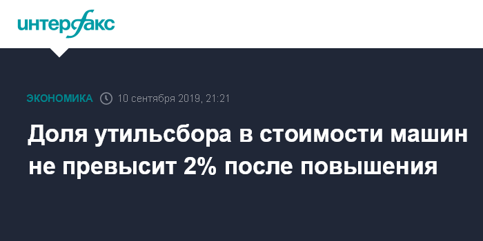 Москва. 10 сентября. INTERFAX.RU - Обсуждаемое в правительстве РФ повышение утилизационного сбора на автомобили с 2020 года необходимо для обеспечения большей экологичности автотранспорта, доля утильсбора в цене автомобиля не превысит 2%, сообщили в Минпромторге.