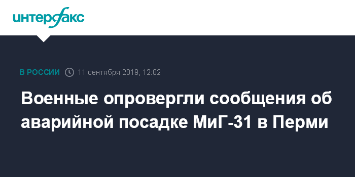 Москва. 11 сентября. INTERFAX.RU - Самолет МиГ-31БМ во вторник штатно сел в аэродроме базирования в Перми, информация об аварийной посадке не соответствует действительности, сообщает пресс-служба Центрального военного округа (ЦВО) в среду.