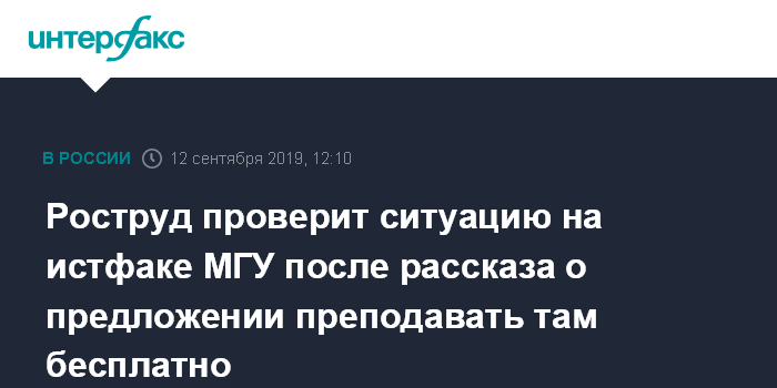 Роструд проверит ситуацию на истфаке МГУ после рассказа о предложении преподавать там бесплатно