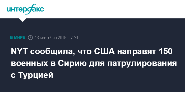 Москва. 13 сентября. INTERFAX.RU - США готовятся направить на северо-восток Сирии около 150 военнослужащих для проведения наземного патрулирования вместе с турецкими войсками, сообщает The New York Times.