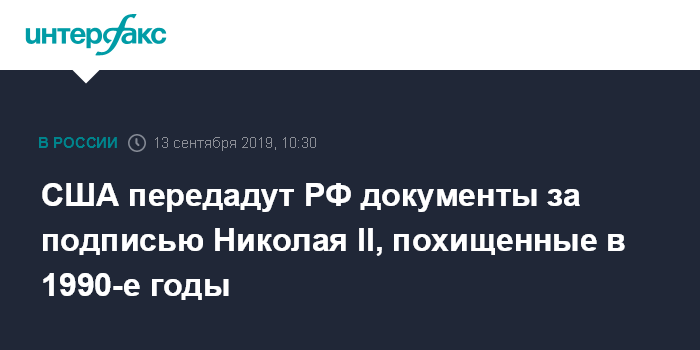 Москва. 13 сентября. INTERFAX.RU - Соединенные Штаты передадут России 16 исторических документов, похищенных из российских архивов в начале 1990-х. Об этом заявили "Интерфаксу" в посольстве США в РФ.