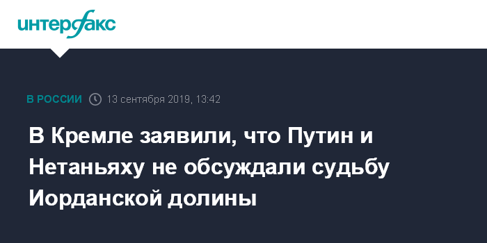 Москва. 13 сентября. INTERFAX.RU - Планы руководства Израиля распространить израильский суверенитет на Иорданскую долину не обсуждались на встрече президента РФ Владимира Путина и премьера Израиля Биньямина Нетаньяху в Сочи, заявил в пятницу пресс-Секретарь российского лидера Дмитрий Песков.