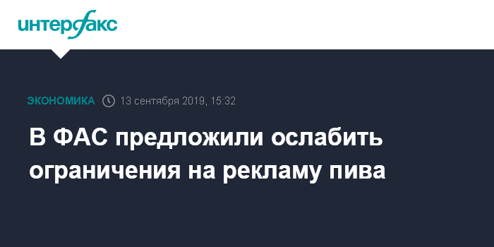 Москва. 13 сентября. INTERFAX.RU - В России нужно ослабить ограничения на рекламу пива и отечественного вина, заявил начальник контрольно-финансового управления ФАС России Владимир Мишеловин. Он сказал это на Форуме пивоваров.