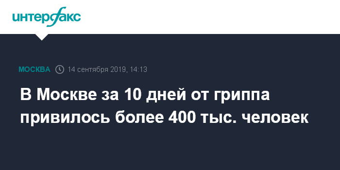 Москва. 14 сентября. INTERFAX.RU - Вакцинацию от гриппа в столице с 4 сентября прошли более 400 тыс. человек, сообщил мэр Москвы Сергей Собянин в субботу.