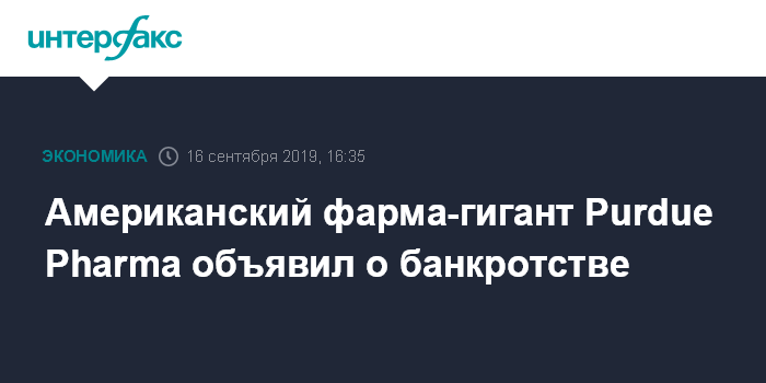 Москва. 16 сентября. INTERFAX.RU - Американская фармацевтическая компания Purdue Pharma объявила себя банкротом, чтобы разрешить ситуацию с более чем 2600 исками из-за ее роли в опиоидном кризисе в США.