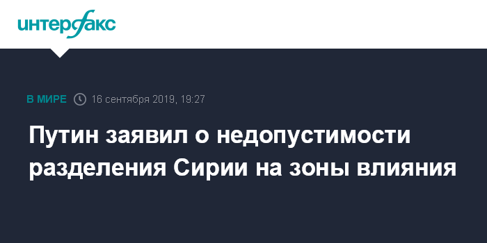 Москва. 16 сентября. INTERFAX.RU - Президент РФ Владимир Путин подчеркнул, что делить Сирию на зоны влияния разных стран недопустимо, это относится и к северо-востоку страны. Такое заявление российский лидер сделал на трехстороннем саммите по урегулированию ситуации в Сирии, проходящем в понедельник, 16 сентября, в Анкаре.