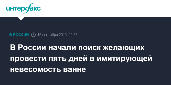 "ИМБП РАН сообщает о наборе испытателей из Москвы и Московской области для участия в исследовании, которое будет проводится с использованием специальных иммерсионных ванн, действие которых на организм сходно с действием невесомости", - говорится в сообщении института, опубликованном в понедельник, 16 сентября.