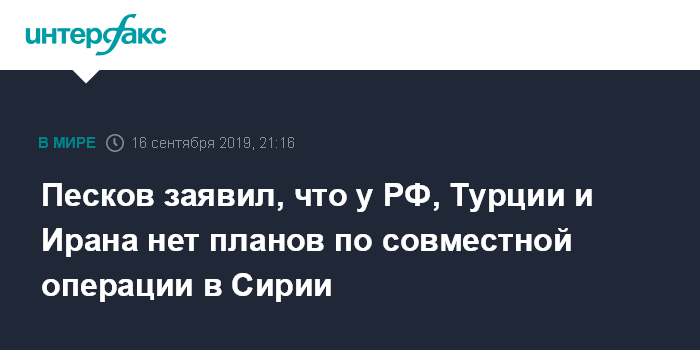 Песков заявил, что у РФ, Турции и Ирана нет планов по совместной операции в Сирии
