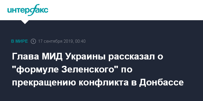 Москва. 17 сентября. INTERFAX.RU - Министр иностранных дел Украины Вадим Пристайко пояснил, в чем заключается условная "формула Зеленского" по прекращению вооруженного конфликта в Донбассе.