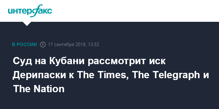 "Иск Олега Дерипаски к издателям Times Newspapers Limited, Telegraph Media Group Limited и The Nation Company LLC о защите деловой репутации зарегистрирован в картотеке краевого арбитажного суда в минувшую пятницу, 13 сентября. Слушания по делу еще не назначены", - сказал сотрудник пресс-службы.