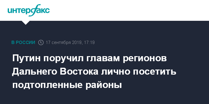Москва. 17 сентября. INTERFAX.RU - Президент РФ Владимир Путин поручил главам регионов Дальнего Востока, пострадавших от паводка, лично, "никому не перепоручая", посетить подвергшиеся паводку районы. Об этом глава государства сказал во вторник на совещании по вопросам ликвидации последствий наводнения в Дальневосточном федеральном округе.
