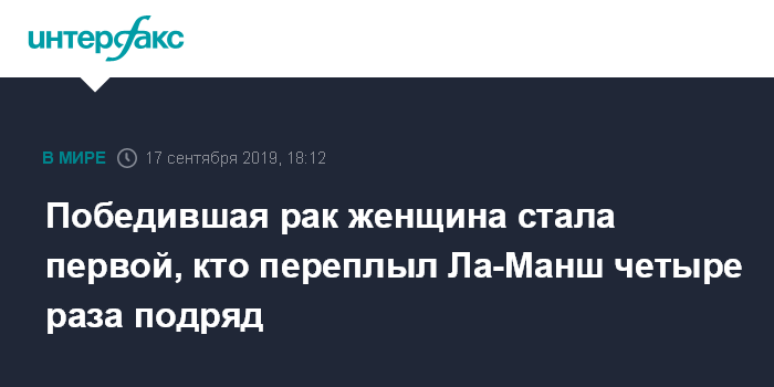 Москва. 17 сентября. INTERFAX.RU - Американка Сара Томас, прошедшая курс лечения от рака груди, стала первым человеком, сумевшим пересечь Ла-Манш четыре раза без перерыва, сообщает во вторник телеканал BBC News.