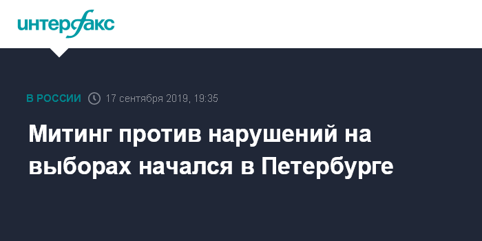 Москва. 17 сентября. INTERFAX.RU - Санкционированный митинг с требованием изучить свидетельства о фальсификациях на муниципальных выборах и привлечь к ответственности виновных проходит во вторник на площади Ленина в Санкт-Петербурге.