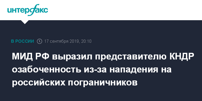 Москва. 17 сентября. INTERFAX.RU - В МИД РФ выразили временному поверенному в делах КНДР в России Чин Чжон Хёпу озабоченность в связи с вооруженным нападением на российских пограничников северокорейских рыбаков, занимавшихся браконьерством в исключительной экономической зоне России в Японском море.
